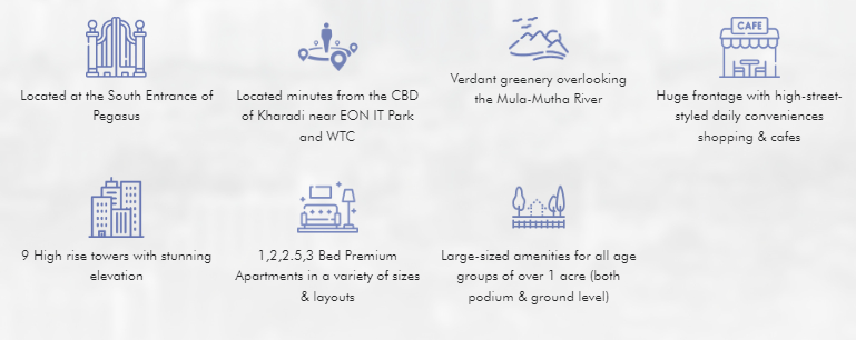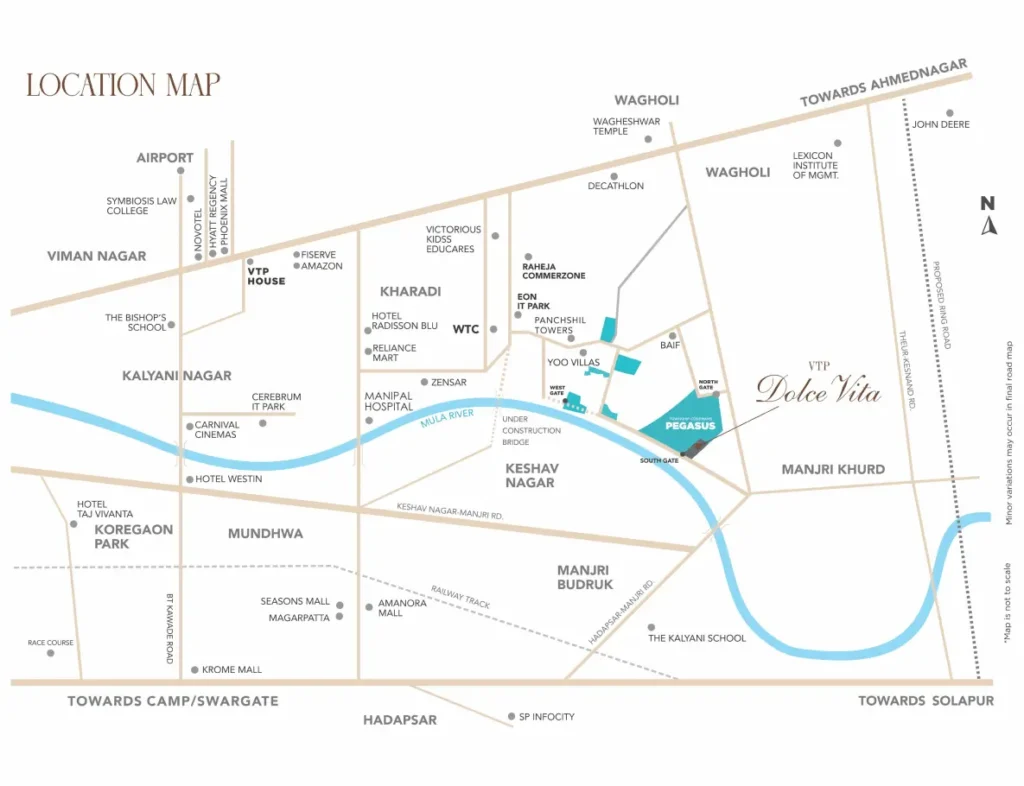 The grand project is spread over 9 acres of beautifully landscaped property. VTP Dolce Vita is an island of peace and tranquillity offering 360-degree green views and overlooks the Mula-Mutha River. Standing tall with 9 high-rise towers with 32 residential floors each, 3 floors of dedicated parking under each floor, Over 300 meters of swanky high street on the main township spine road.